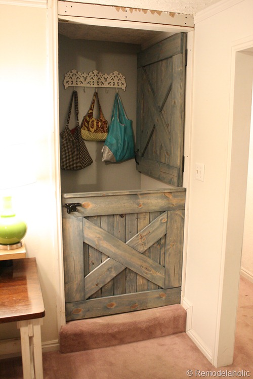 Cassity from Remodelaholic designed a Dutch Barndoor to double as a baby gate at the bottom of stairs.