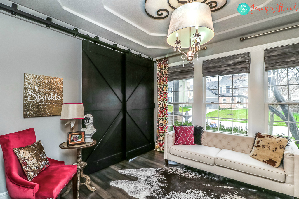 Of course I will start with my own barndoors! My black bypass barndoors separate my office from the foyer and provide some workspace privacy that I need with 3 wild children running around while momma is working from home.