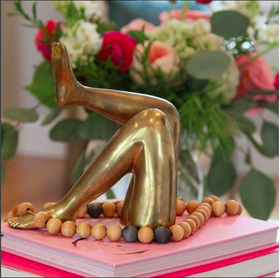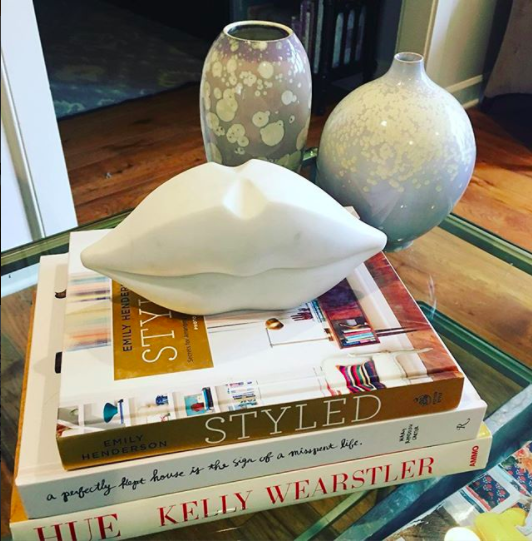 - Her Kelly Wearstler brass leg bookends and marble lips she decorates with: