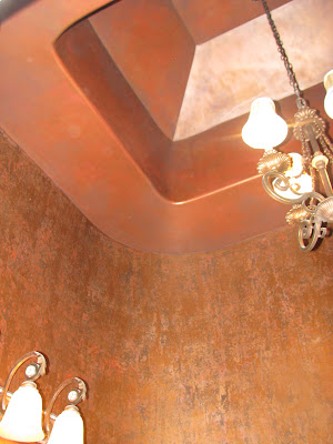 This is THE perfect finish for a powder room — just the right size to go over the top! The bronze looks magnificent and the ceiling — well quite frankly, it’s so very striking, I can’t tell where the wall ends and the ceiling begins. Marvelous talent!