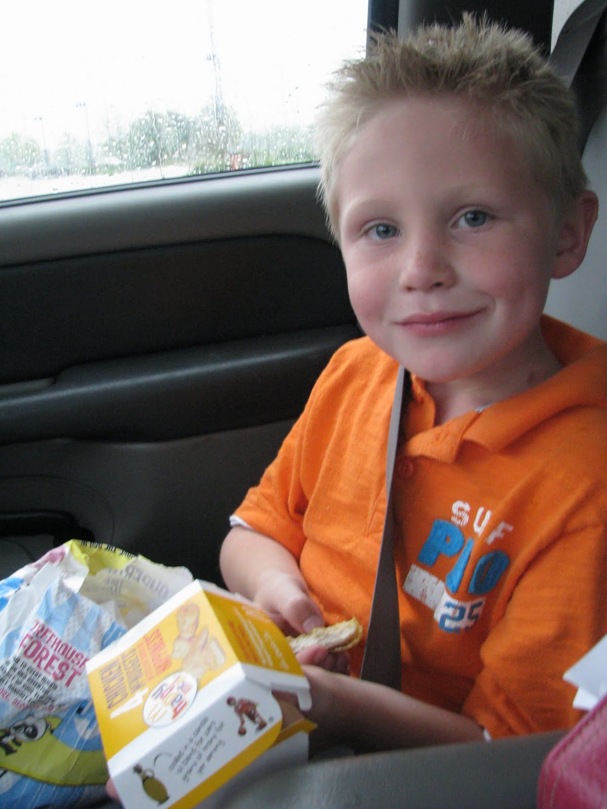 12: 45: We take a quick break for a couple of garage sales in the pouring rain. He spends 15 cents…. he is easily entertained. I spend nothing and am bummed I didn’t find any great furniture deals.