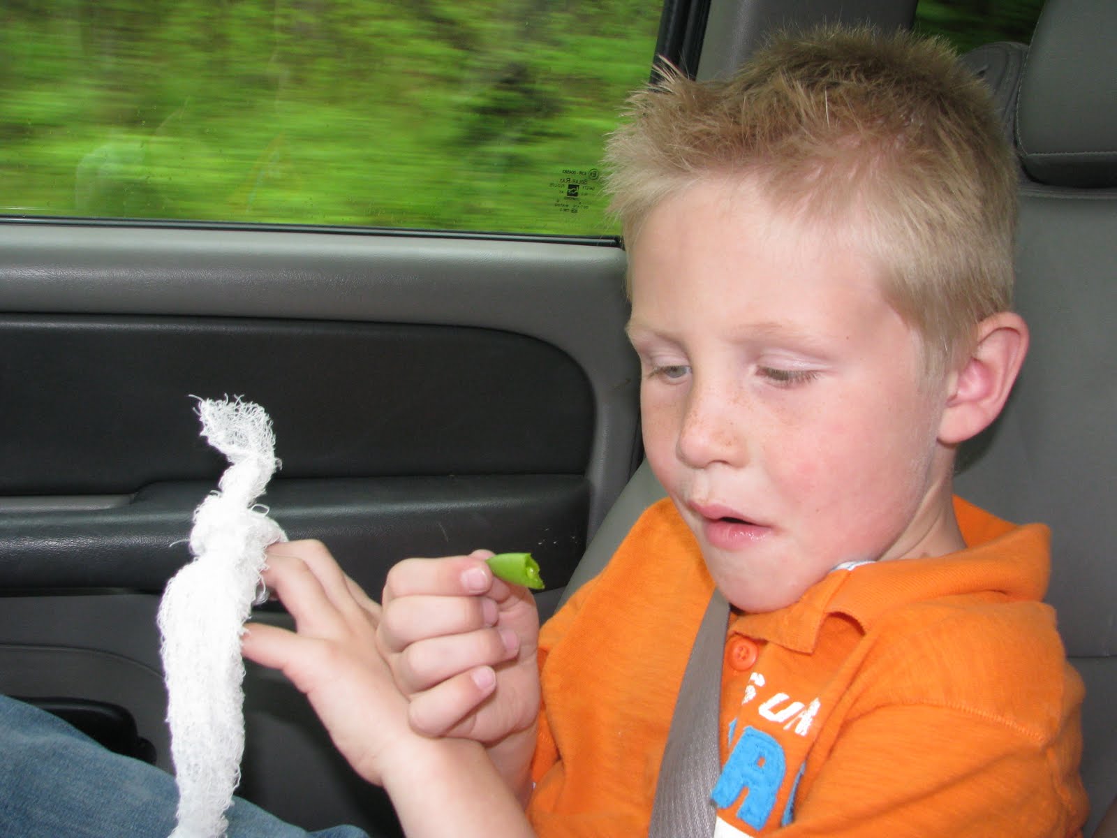 3:00: Had a small issue with Easton cutting himself on a faux tool (he was trying to cut a door handle into the box)…..I made a make-shift band aid with a piece of the cheesecloth we use to glaze with. I was his hero.