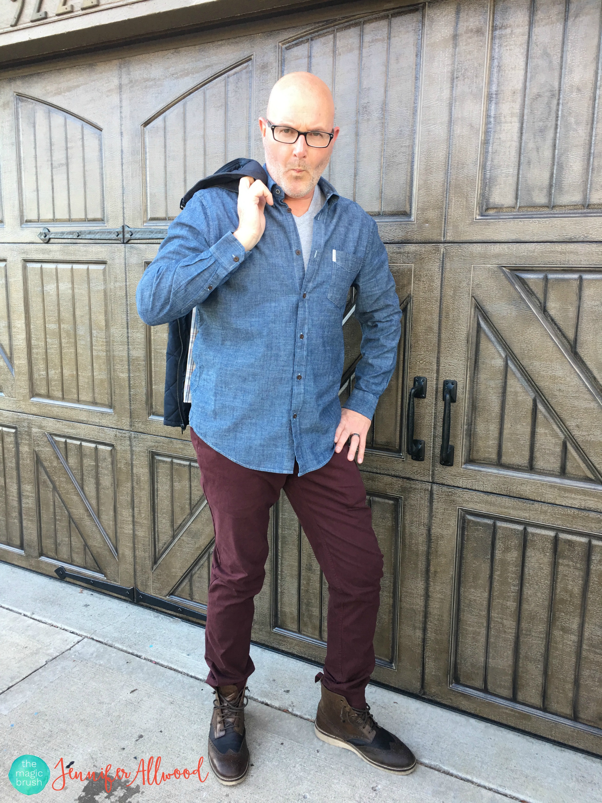 Modeling the burgundy pants and chambray shirt didn’t go much better. Lol. He’s a goofball!
