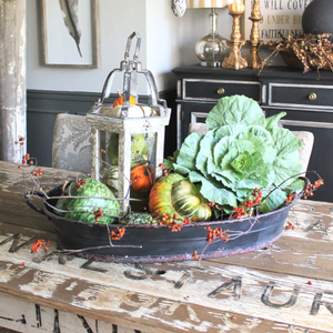 For more DIY Thanksgiving decorating ideas, look at my disposable Thanksgiving Tablescape – so easy and quick! I also love this natural Thanksgiving tablescape I did with glittered pumpkins and headgeapples and a doughbowl — like the one above. Another easy DIY project is my glittered Give Thanks burlap banner — it looks so festive on my mantle!