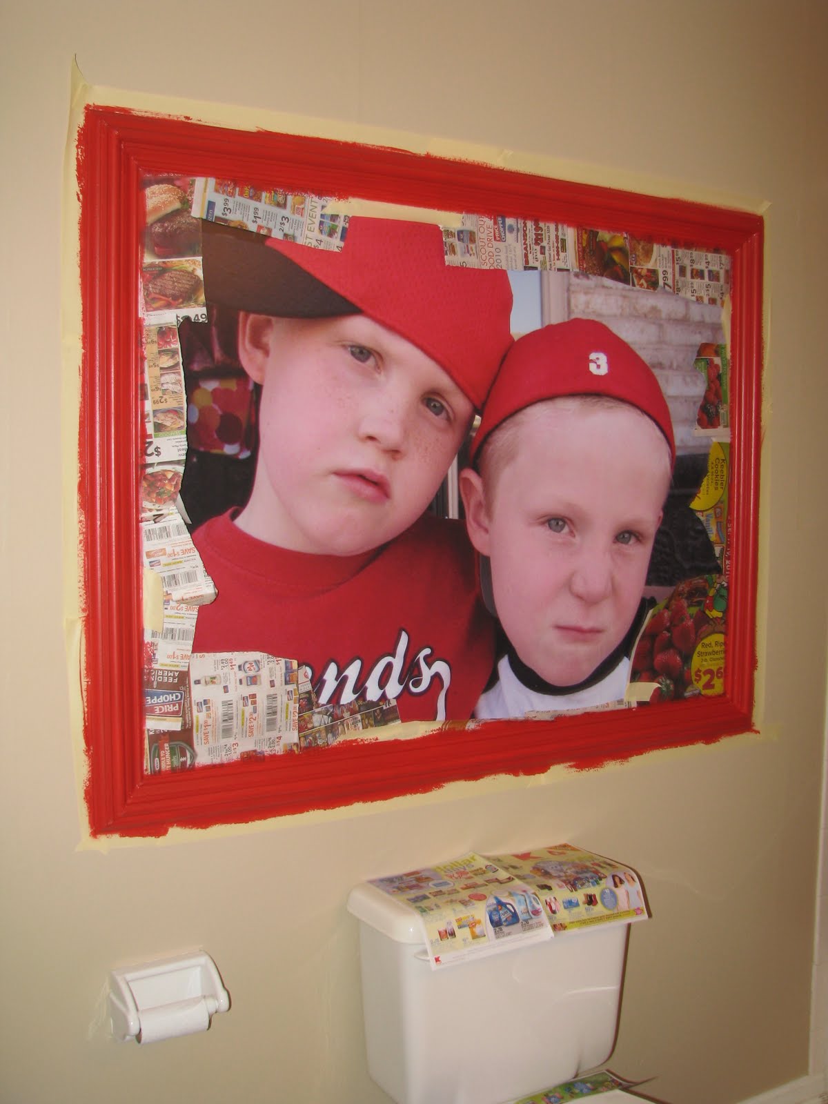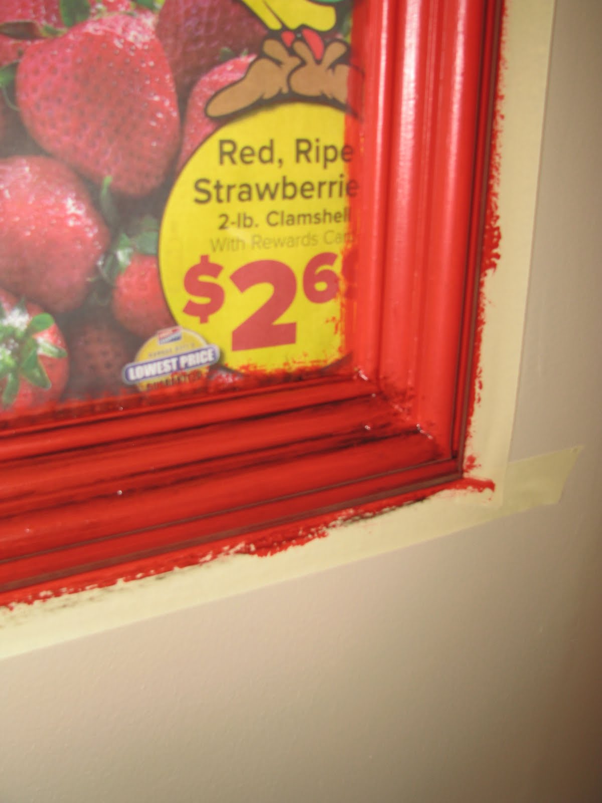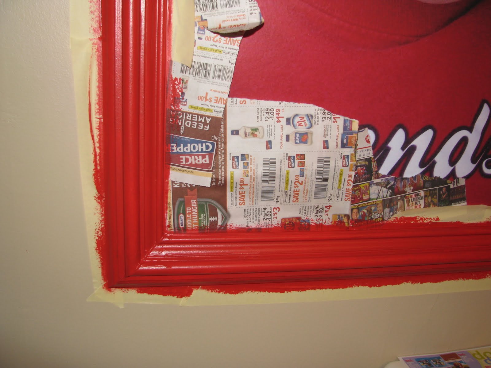 I needed to tape off the trim. I was scared to tape over the vinyl poster (in retrospect, it would have been fine)….so I slid newspaper under the trim.
